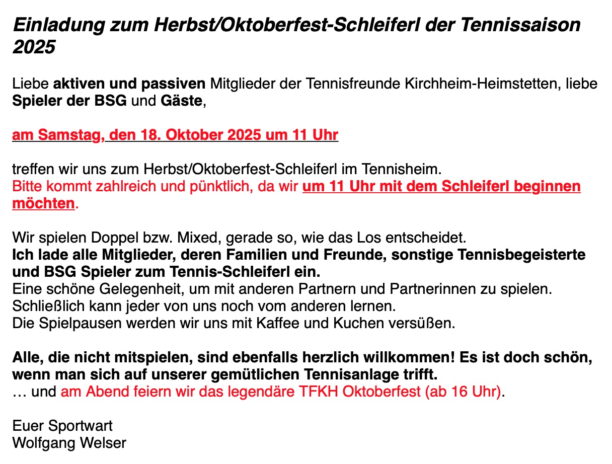Liebe aktive und passive Mitglieder der Tennisfreunde Kirchheim-Heimstetten, liebe Spieler der BSG ,